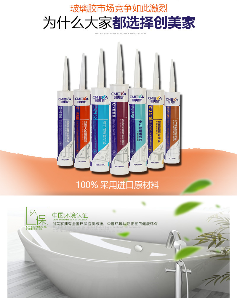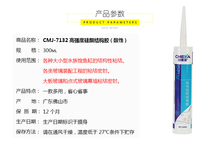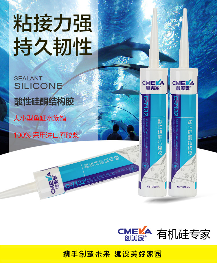 1、創美家C-7132系單組份、醋酸型、高模量、室溫固化結構膠。